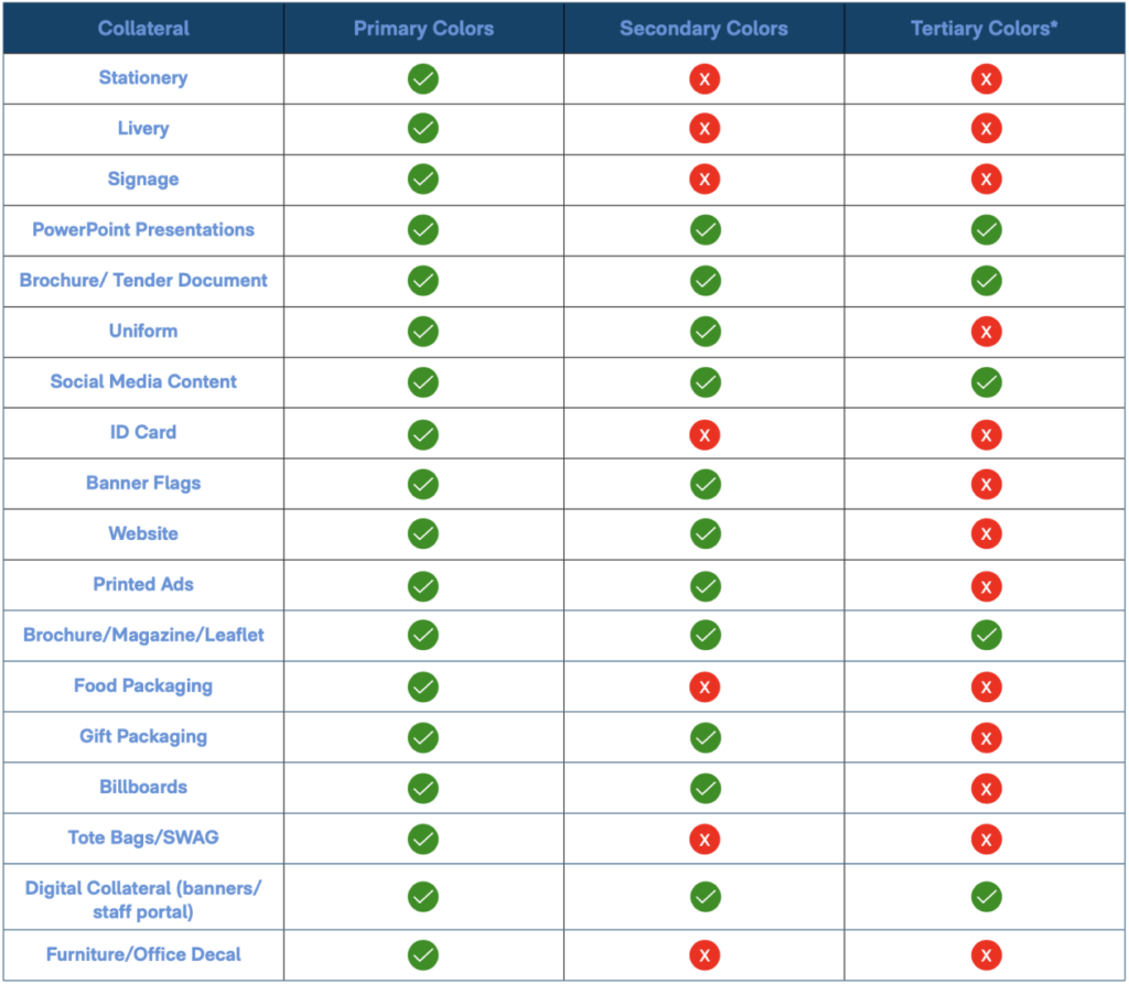 The following table illustrates the range of our primary, secondary and tertiary palettes and specifies which collaterals it will and will not be used in. Please adhere to the table provided and seek approval from the CEO for use of colors beyond the established guide.