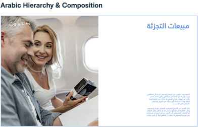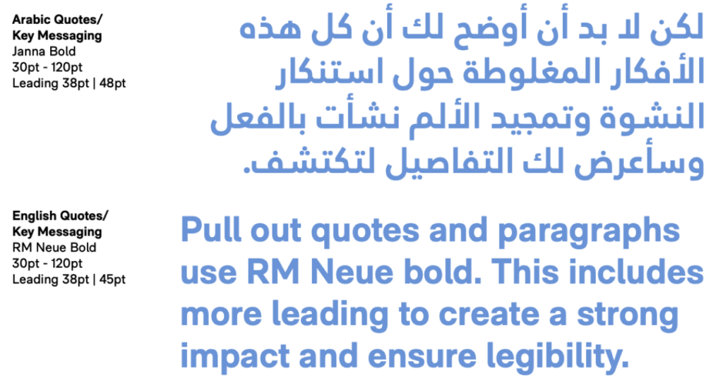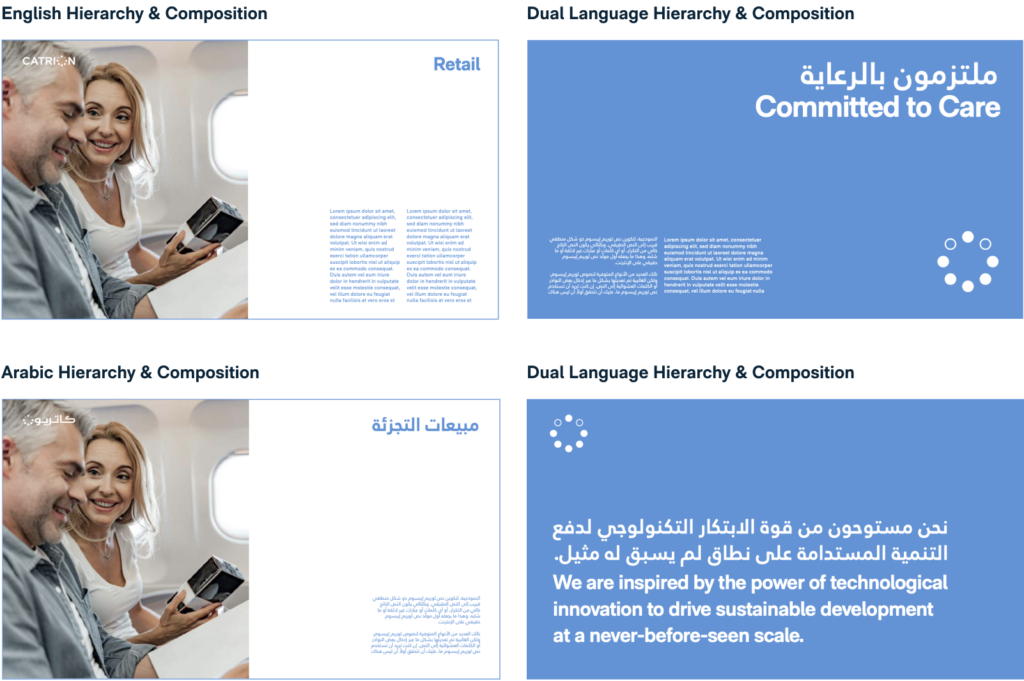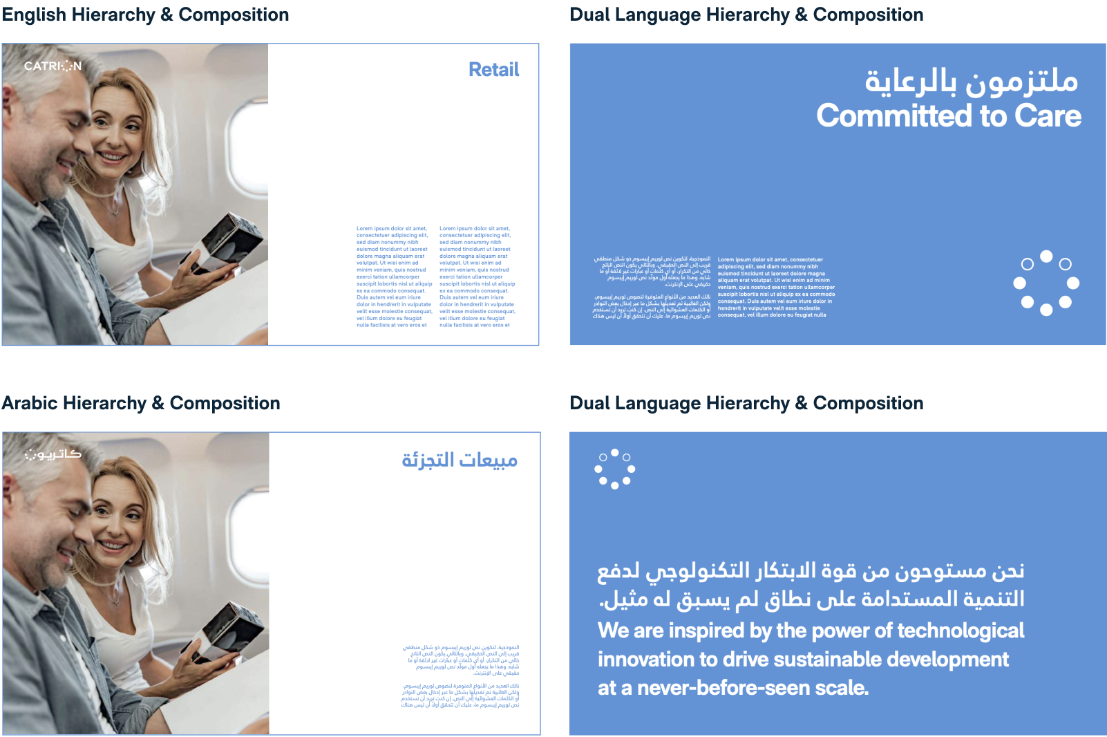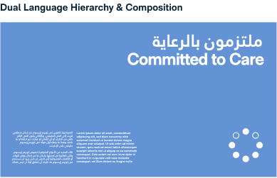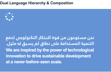 The hierarchy and composition displayed depicts how layouts can accommodate both Arabic and English languages. Ensure that the type appears harmonious and visually similar.