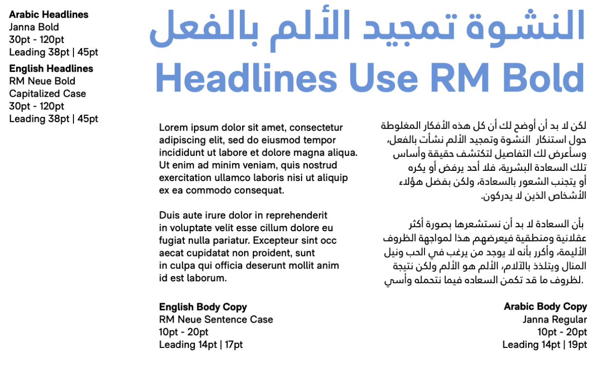 System fonts have been selected for use only when RM Neue and Janna LT are not available. To reflect the characteristics of the Arabic font, Tahoma is a sans serif system font that will be presented in bold and regular, paired with Arial that captures the same essence of the RM Neue type. The dual language font is accessible to both Mac and Windows.