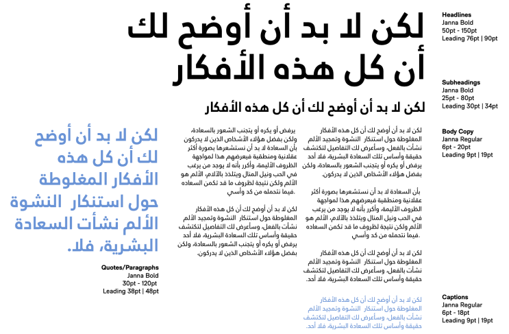Janna LT is classified as a humanist Kufic typeface, which combines elements of Kufic style with characteristics inspired by handwriting. This unique blend results in a more informal and friendly version of the typically structured and geometric Kufic style. As the counterpart to the English typeface, Janna LT maintains a cohesive aesthetic through its distinctive serifs and welcoming curves. These design features harmoniously reflect the style and sophistication of the English typeface while adding a touch of individuality and approachability.