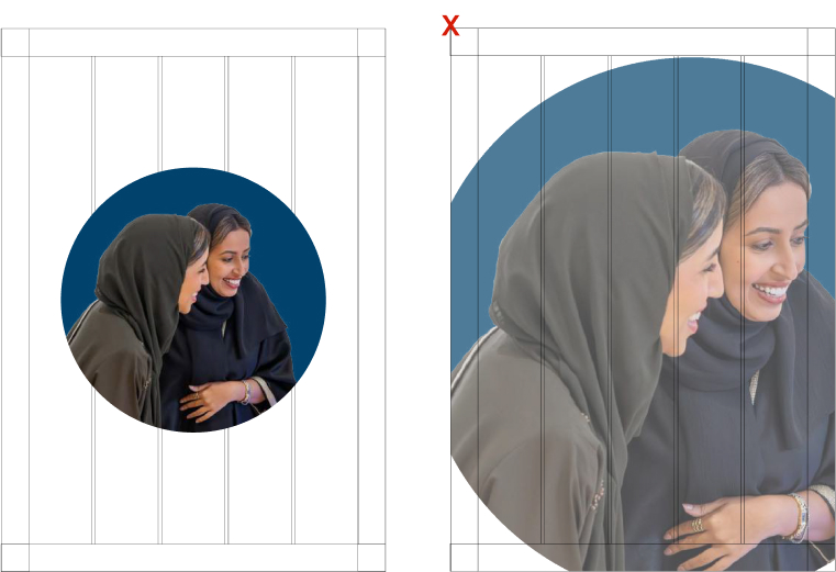 A single circle element will be used in photography with an opacity of 70% for the sea blue color to highlight a subject matter. Only use the secondary colors at all times.
